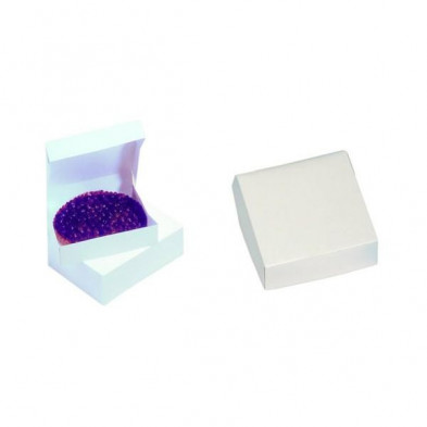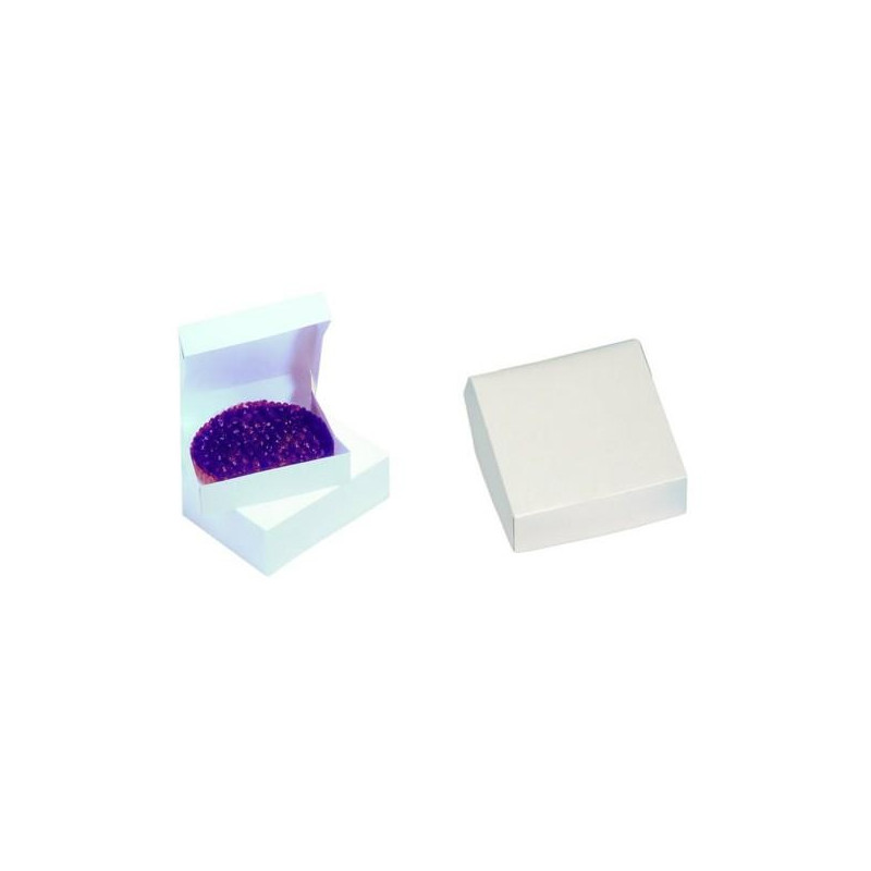 Caja para tarta de 22 cm de lado por 8 cm de alto, con tapa incluida e integrada en una pieza.