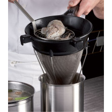 Este cuela-salsa colador chino fino está diseñado de forma ergonómica y atiende a las normas de higiene más estrictas: Mango relleno, ergonómico y aislante de calor. Cuerpo y mango monobloque en material compuesto: Indeformable y sólido. Tela fina en malla de acero inoxidable para una perfecta higiene. Cruceta de refuerzo de acero inoxidable. 2 patas de apoyo para una perfecta estabilidad.
