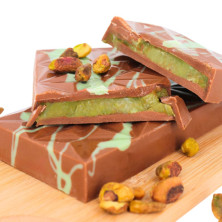 Ingredientes: Azúcar, aceites vegetales y grasas (girasol, coco, manteca de cacao), pistacho (20%), leche desnatada en polvo, kadayif crujiente (harina de trigo (gluten), agua), suero en polvo, emulsionante E322 (girasol), sal, aroma natural de vainilla, colorantes E100i-E141ii.